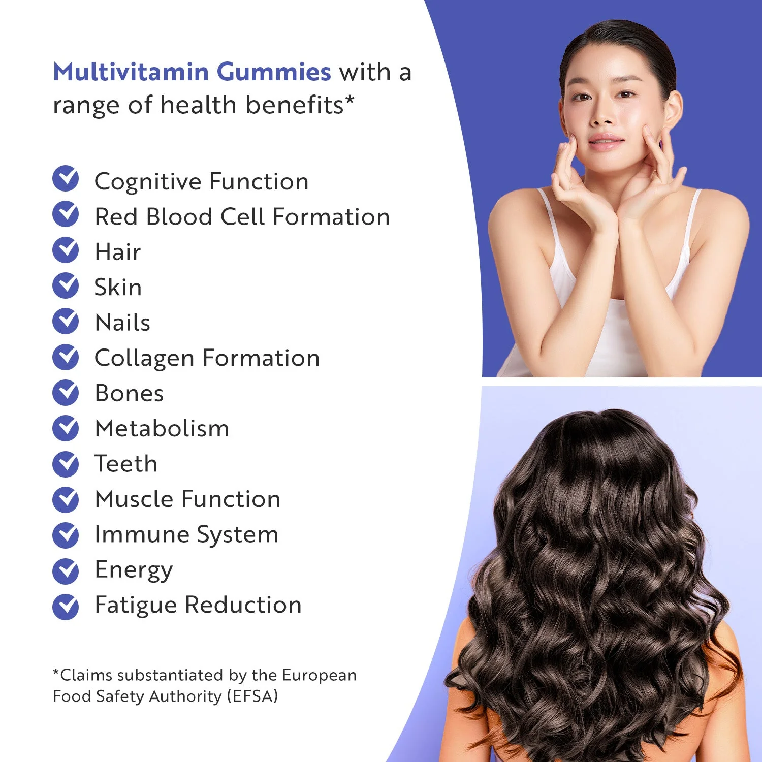 Our Multivitamin gummies comes with a multitude of health benefits. Though the full list of benefits is too extensive to detail, some of the health benefits associated with the 14 essential active vitamins & minerals are reduction of tiredness & fatigue; maintenance of normal immunity; maintenance of normal bones, teeth, hair and skin; and maintenance of normal muscle function. Claims substantiated by EFSA.